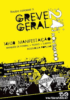 No passado dia 15 de Outubro, a manifestação que juntou em Lisboa milhares de pessoas apelou a uma Greve Geral. Depois da sua convocação conjunta pela CGTP e UGT, a plataforma que organizou a mobilização do dia 15 de Outubro em Lisboa anunciou o seu apoio à paralisação do próximo dia 24 de Novembro e a realização de uma manifestação nesse dia de luta. A manifestação está anunciada para as 14h30 no Marquês de Pombal, donde parte para o Rossio (para encontrar a concentração de trabalhadores organizada pela CGTP), seguindo depois para São Bento. Esperamos e trabalhamos para que esta seja uma grande manifestação, num grande dia de paralisação dos trabalhadores. Apelamos, portanto, nesta convocatória aberta, à participação de todos os movimentos e de todas as pessoas: mais e menos precários, com e sem emprego, já reformados ou ainda estudantes – todas as vítimas do regime da austeridade são importantes nesta jornada.