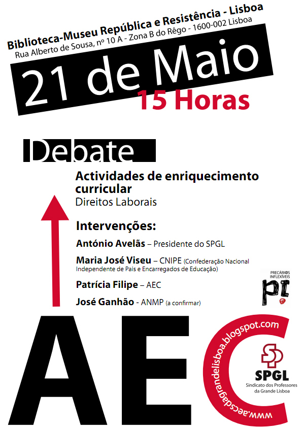 Os professores das Actividades de Enriquecimento Curricular (AEC) da Grande Lisboa estão a organizar um debate sobre as suas condições laborais que tem data marcada para o próximo Sábado, dia 21 de Maio, na Bilioteca-Museu da República e Resistência.