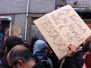 Mais de 150 pessoas, incluindo muitas pessoas do bairro, protestam junto ao projecto Es.Col.A. Foram montadas três linhas policiais após a invasão do edifício para impedir as pessoas de se aproximarem da escola. Os populares defendem o espaço, antes abandonado, que agora funcionava para dar aulas, formação e servir de centro cultural. Fora da lógica de mercado, sem mensalidades e acessível a todos os cidadãos, independentemente da sua classe social ou condição económica. O regime da austeridade não suporta a democracia e a igualdade.