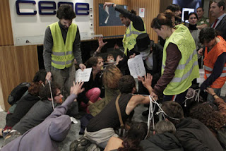 “Indignados” invadem pacificamente a sede da CEOE, onde estiveram alguns minutos em protesto contra a reforma laboral que beneficia os patrões. Foto El País.