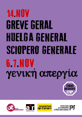 O primeiro que divulgamos é assinado pela Juventud Sin Futuro (Espanha), com Atene in Rivolta (Itália) e com Δίκτυο Επισφαλώς Εργαζομένων & Ανέργων / Ελλάδα (Network of precarious workers and unemployed / Grécia). Como é sabido a Grécia começa hoje uma Greve Geral de dois dias e no dia 14 de novembro Portugal, Espanha, Itália e outros países europeus vão parar contra o regime de austeridade que cria recessão e desemprego.