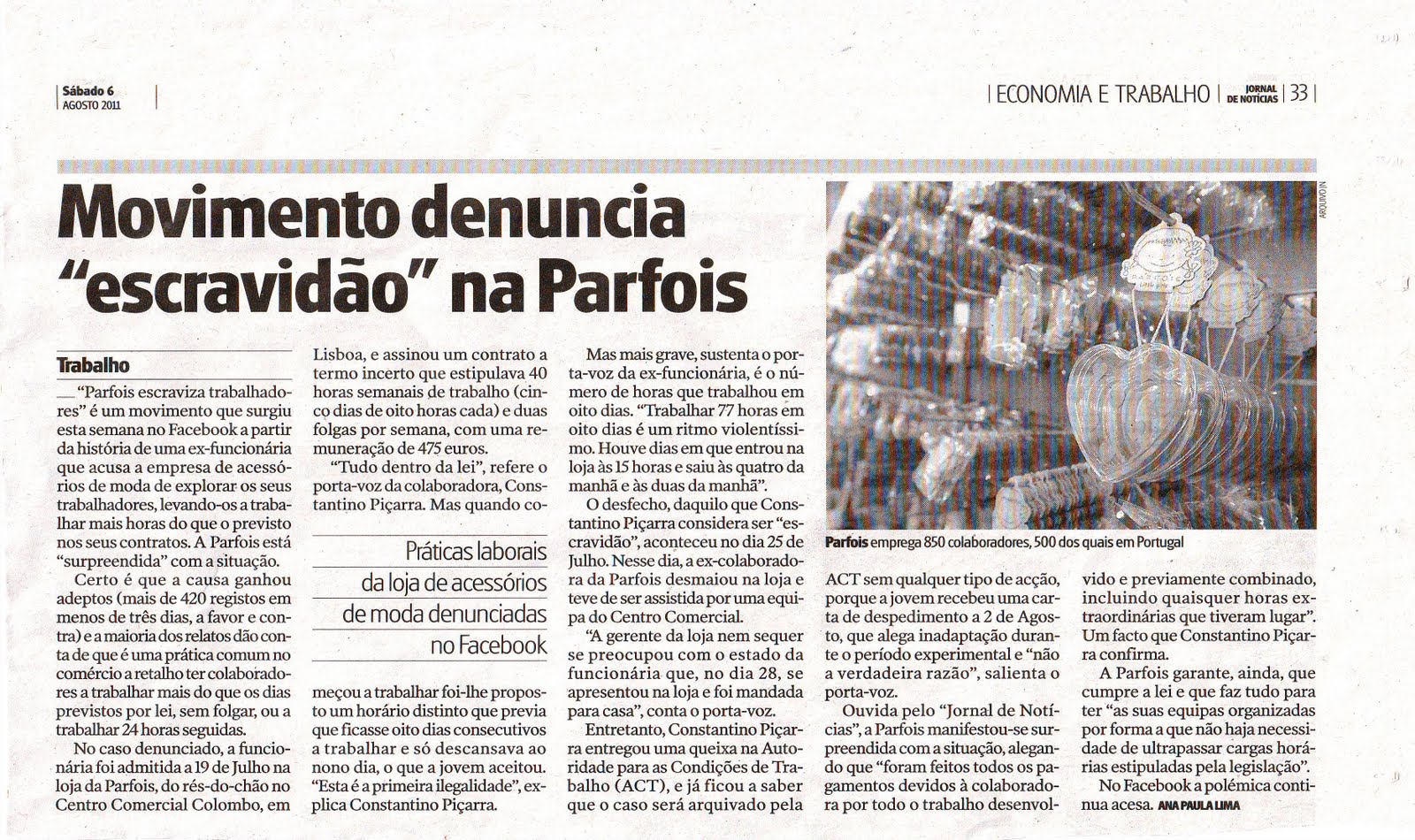 Na passada segunda-feira, 1 de Agosto, os Precários Inflexíveis publicaram uma denúncia de uma funcionária da loja da Parfois. Essa funcionária trabalhou 77h em apenas 8 dias, sem ter tido direito aos descansos, horários e ritmos de trabalho estabelecidos no Código do Trabalho. Chegou mesmo a ter de ser assistida pela equipa médica do Centro Comercial porque desmaiou em virtude de estar à demasiado tempo sem comer.